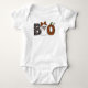 Prepare-se para outubro com nosso body de bebê BOO 2024 com um morcego e abóboras.