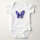 Borboleta de flores cinza, azul, safira, espumante com asa decorada com flores preciosos azuis com folhas de ouro sobre fundo branco.