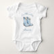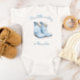 Este macacão de bebê fofo apresenta uma ilustração em aquarela de um par de botas de cowboy azuis. Acima, a frase "Nosso pequeno cowboy" ou outro texto de sua escolha aparece em escrita à mão azul. Personalize com o nome do bebê abaixo. Um design ideal para um chá de bebê de menino.