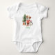 Este terno doce tem um cachorrinho vestido com um suéter de Papai noel vermelho sentado ao lado de uma árvore de Natal. Um pinguim bebê está sentado ao seu lado. Você personaliza com o nome do seu filho abaixo deles em um bonito roteiro verde.