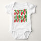 Este macacão-bebê tem um padrão repetitivo de ovais em vermelho e verde com ovais brancos espalhados em um campo de branco.