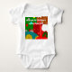 Este macacão de bebê tem uma design de Natal de uma colagem de árvore de Natal, um ornamento, uma estocagem, um presente, e um menino de pão de gengibre.