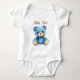 A sweet crocheted teddy bear themed personalized baby one piece.. A sweet blue and brown crocheted teddy bear graphics, Add baby's name in the personalize area.