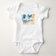 Traje de bebê dinossauro - perfeito para presente de chá de fraldas de dinossauro ou bebê recém-nascido. O design é escrito com "Rawr significa que eu te amo" em cores legal e modernas de azul e amarelo - que você pode editar se desejar (basta clicar em "personalizar mais" ou "editar usando a ferramenta design").