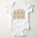 Este casaco de bebê tem uma design moderna do século médio de círculos concêntricos em ouro, laranja e turquesa sobre um fundo branco.