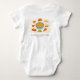 Um body "Meu Primeiro Dia de Ação de Graças" fofo e engraçado para o seu bebê ou bebê menino para celebrar o feriado, apresentando um design circular de alimentos favoritos do Dia de Ação de Graças com macarrão e queijo no centro em vez do peru esperado. Personalize com um ano e um nome clicando no botão Personalizar e editando os campos do modelo. O design está em ambos os lados.