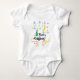 Roupa de bebê com design de tipografia com o desejo Feliz de Natal. Pinheiro de Natal, lua amarela e flocos de neve. Excelente para vestir os feriados familiares. Ver todas as lojas bit.ly/SandyspiderStores