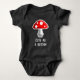 Um cogumelo ágar de arte de pixel. As palavras leram "Cute as a button" que é um trocadilho baseado em botões sendo cogumelos bebês/imaturos. Esta versão da design tem contornos brancos e texto, de forma que se destaca em roupas escuras.