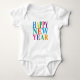 Celebre o Ano Novo com sua família e amigos com este design cor e fofo, que apresenta um grande texto que diz "feliz ano novo" com letras em cores azul, laranja, verde, amarelo, fuchsia, aqua e roxo.