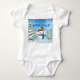 Feliz Férias Polar Bear Penguin Criança Creeper mostra uma cena de neve com pinheiros cobertos de neve, queda de neve, flocos de neve, um urso Polar Feliz vestindo um cachecol azul com um pinguim nos ombros vestindo um chapéu de Papai Noel. O texto azul estilizado é Feliz Feriados. Escolha seu estilo e cor da camisa em "Opções de cor e estilo" para homens, mulheres, crianças e bebês. Perfeito para vestir este Holiday Season ou como presente de Natal. Este design foi criado usando o original artwork©delightful-doodles.com (http://delightful-doodles.com/)