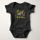 Esta roupa preta para bebês apresenta o texto "O PRIMEIRO Natal do Bebê" numa fonte de escrita amarela alegre. Condecorações festivas vermelhas e verdes de Natal, incluindo um chapéu de Papai Noel, um Enfeites de natal, e meias, adornam o texto, celebrando a primeira temporada de festas de um bebê.