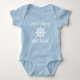 Costumado primeiro-oficial náutico de helm azul-bebê. Bonita roupa de salto personalizada para crianças. Vestuário náutico para criança, com a roda e o nome personalizado do navio ou letras iniciais monográficas. Ideia de presente de primeiro aniversario marítimo para o novo filho ou filha do marinheiro. Faça o seu próprio para filho, filho, sobrinho, primo, sobrinha, amigos etc. Tipografia de safra com design de logotipo de roda de barco. Roupas e roupas personalizáveis para navegação/barco no lago ou no oceano. Também é bom para viagens de cruzeiro ou de vela. Adequado para meninos e meninas.