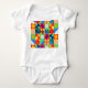 Este macacão-bebê tem um design de quadrados Bauhaus com formas ímpares dentro, repetido através do design.