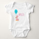 Este terno de bebê possui um belo flamingo rosa com um balão azul. O nome do bebê está escrito em bonito fonte rosa. Personalize o seu hoje! Trabalho de arte criado por: AMBilustrações http://www.etsy.com/shop/AMBillustrations/