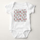 Este macacão-bebê tem um médio de flores moderno do século design feito de círculos em tons de rosa, amora-framboesa, bege e linhas pretas.