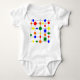Este macacão-bebê tem uma design Bauhaus de uma grelha com formas em vermelho, amarelo, laranja, verde e azul plotadas sobre ela.