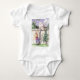 Uma ilustração vintage de um livro para crianças mostra uma garotinha se aproximando para pegar a mão de Humpty Dumpty que está sentada sobre uma parede. O roupa de bebê e criança está disponível em uma variedade de estilos, cores e tamanhos para você escolher.