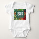 Body de bebê JESUS Natalino com design abstrato festivo não tradicional e uma mensagem natalina tradicional, que inclui tons de vermelho e verde, além de estrelas douradas falsas e tipografia branca em negrito. Ótimo para o primeiro Natal do bebê. Parte da Coleção CHRISTMAS STARS da Berean Designs. Presentes combinando disponíveis. Escolha entre uma ampla seleção de roupas, cartões, decoração para casa e presentes natalinos cristãos, projetados pela Berean Designs.