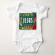 Conjunto de body para bebé de Natal JESUS com estilo e design abstrato festivo não tradicional com uma mensagem tradicional de Natal, que inclui tons de vermelho e verde, além de estrelas douradas falsas e tipografia branca em negrito. Ótimo para o primeiro Natal do bebê. Parte da Coleção CHRISTMAS STARS da Berean Designs. Presentes combinando disponíveis. Escolha entre uma ampla seleção de roupas de Natal cristãs, cartões, decoração para casa e presentes, projetados pela Berean Designs.