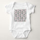 Este macacão-bebê tem uma design de repetições de blocos de linhas que se cruzam em rosa, rosa-escuro, verde-claro, verde-escuro, creme e preto. Se você gosta do design, mas prefere cores diferentes, me mande mensagem.
