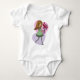 Linda menina caprichosa de longos cabelos amarelos ondulados e vestindo um vestido verde e meias listradas. Ela está segurando um lindo buquê de rosas vermelhas em seus braços estendidos. O fundo é composto por um coração de amor rosa e roxo.