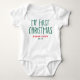 Celebre o primeiro Natal do bebê com este belo traje personalizado. Com as palavras "meu primeiro Natal" num tipo verde festivo de férias, esta design também tem espaço para texto personalizado como um nome, ano ou outras informações. Este design vermelho e verde faz um presente de bebê excelente, um anúncio de nascimento divertido ou uma forma doce de se lembrar do primeiro feriado do seu novo bebê.