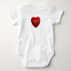 A primeira parte está na frente da roupa, e a segunda parte da citação está na parte traseira, em um coração vermelho brilhante.