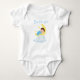Esta imagem encantadora mostra um bebê dormindo de pijama azul descansando sobre uma lua crescente com uma base nuvem lisa, cercada por estrelas amarelas. O texto "Nascer de ser uma estrela" em azul acrescenta um toque mágico.