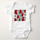 Natal Alegre E Brilhante Festivo Retro Groovy Body Infantil Moderno apresenta o texto "Alegre e Brilhante" em tipografia moderna de letra manuscrita vermelha e verde e acentuado com estrelas e flores. Perfeito para o primeiro Natal do bebê, chá de bebê ou presente para as festas de fim de ano. Criado por ©Evco Holidays www.zazzle.com/store/evcoholidays