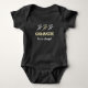 "CACHORRO que estou no comando!" - este é um belo traje de bebê para um entusiasta da corrida. O texto pode ser personalizado adicionando um nome ou adicionando sua própria legenda. A imagem é um pictograma de três corredores, com o médio em cor de ouro.