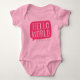 Roupa com impressão personalizada com gráfico "Olá Mundo" e texto personalizado para adicionar no nome do seu bebê. Clique em Personalizar para personalizar o design com seu próprio texto e imagens. Escolha entre uma grande variedade de estilos e cores de camisa.