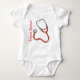 Um traje de uma peça de bebê branco, bonito, com gráficos de um estetoscópio vermelho e texto vermelho lendo o Future Doctor. ideia de presente de chá de fraldas Excelente.