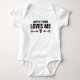 Body de bebê personalizado com texto em negrito, setas decorativas com coração.