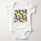 Este macacão-bebê tem um design geométrico de quadrados em roxo, amarelo e verde espalhados com seus contornos.