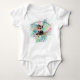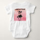 Adorável bruxinha andando com seu melhor vestido de Halloween e bolsa. O traje dela é preto com bolinhas cor-de-rosa pálido, renda franzida e laços. Personalize-o na parte inferior com o modelo fácil de usar fornecido. O fundo é aquarela rosa. Este body precioso é perfeito para a sua pequena usar por toda a temporada.