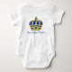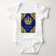 Camisas de bebê príncipe meninos com bonito azul real e coroa de jóia dourada em um fundo de redemoinho azul real e dourado. Você pode adicionar o texto de sua escolha para personalizar esta adorável camisa de bebê príncipe. Há também uma coroa na parte de trás onde você pode adicionar texto, ou você pode removê-la se preferir.