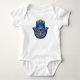 Proteja seu pequeno com estilo com este belo design da Mão de Hamsa. Esta peça apresenta uma impressionante palma azul profunda adornada com intricado trabalho de pontos dourados e um olho central, simbolizando proteção, paz e boa sorte.