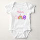 Este adorável traje apresenta um arco-íris pintado manualmente, cor d'água, corações e confete falsa de ouro.