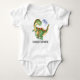 Este belo traje de garotos apresenta um dinossauro verde e laranja com texto que diz "ROAR". Personalize este produto com o nome de sua escolha. A fonte e o texto também são personalizáveis.
