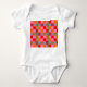 This bay bodysuit has a mid-century modern design of red, pink, and orange squares and green and blue lines forming a plaid design.