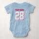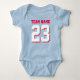 Belo terno de camisa de futebol para bebê. Mamãe e pai adoram esportes. É natural que o bebê também. Belo traje de bebê em azul real, vermelho e branco. Você pode personalizar o nome e o número do jogador na frente e atrás da camisa. Não só para fãs de futebol. Qualquer tipo de fã desportiva apreciará esta design. Baseball, basquete, futebol, hóquei no gelo e muito mais.