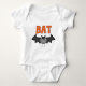 Um morcego preto do Halloween e um texto laranja que diz "BAT" em t-shirts de morcegos, fatos, canecas, cartões, autocolantes, sacos de tote, botões, ímãs e outras t-shirts e presentes MTD do Halloween.