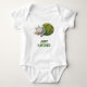 Roupa de peito bonita para bebês com ilustração de um triceratops de dinossauro que eclode do seu ovo. O texto diz "apenas eclodido", mas pode ser personalizado. Ilustrada e projetada por Patricia Alvarez.