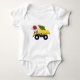 Um belo exemplo de um veículo de caminhões de Natal vestindo um chapéu de Papai Noel e decorado em luzes de Natal que transportam uma árvore de Natal festiva. Perfeito para rapazes e raparigas que adoram caminhões de construção, caminhões de brinquedos ou maquinaria pesada. Um traje de bebê de Natal ideal para entusiastas de caminhões grandes ou pequenos, raparigas ou rapazes.