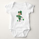 Um bebê T-Shirt com uma Ilustração de um lindo e feliz duende sorridente e dançante, ele está vestindo um terno verde e um chapéu de cima e está cercado por salpicos de cor arco-íris Um design perfeito para celebrar o Dia de São Patrick, desenhado por Radka2D