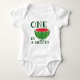 Um traje de bebê com um "Um" em um design de desenho de Melon. Apresenta um sorriso, uma melancia, desenho de fruta e palavras verdes.