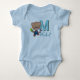 Urso de Teddy Bonito com olhos em forma de coração, com Enfermeiro Alfabeto Inicial segurando uma flor e um pássaro em sua mão. Personalize este belo traje do BABY com o nome do seu pequeno. Presente de excelente, Presente de Chá de fraldas, Novo Presente de Chegada.