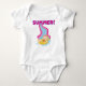 Um design bonito para o verão, mostra uma menina loira de cabelos no biquíni e anel descendo o diapositivo de água e texto rosa quente e azul que lê SUMMER! T-shirts de Verão, fatos-chave, bíblias, canecas, cartões, bolsas, autocolantes, guardas, travesseiros e muito mais.
