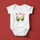Vista seu pequeno(a) Valentim(a) com charme divertido usando este adorável body de bebê com uma ilustração alegre de dois abacates de desenho animado sorrindo, cercados por corações vermelhos brilhantes. Desenhados em um estilo caprichoso de livro infantil, os abacates simpáticos e o trocadilho divertido "Você guac meu mundo!" tornam esta roupa uma maneira divertida e festiva de celebrar o Dia dos Namorados, aniversários ou a doçura cotidiana.