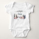 A winter onederland 1st birthday baby bodysuit for a one-year-old birthday with watercolor mountains and script typography background and snowflakes. Perfect baby clothes for 1st birthday